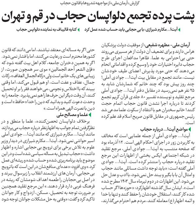 روزنامهٔ آرمان ملی: پشت پرده تجمع دلواپسان حجاب در قم و تهران