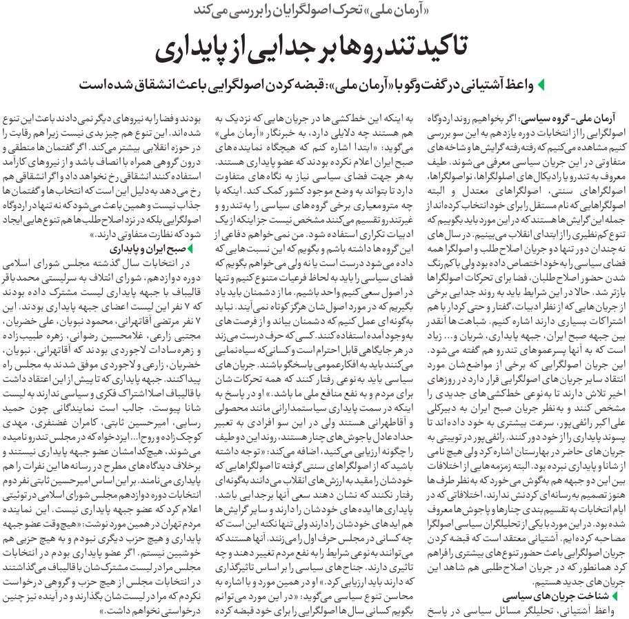 روزنامهٔ آرمان ملی: تاکید تندروها بر جدایی از پایداری