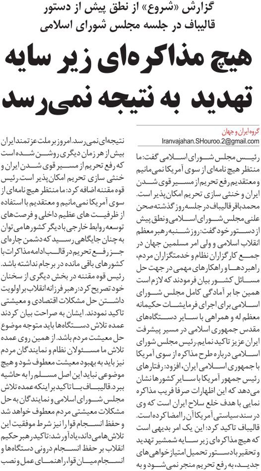 روزنامهٔ شروع: هیچ مذاکرهای زیر سایه تهدید به نتیجه نمیرسد