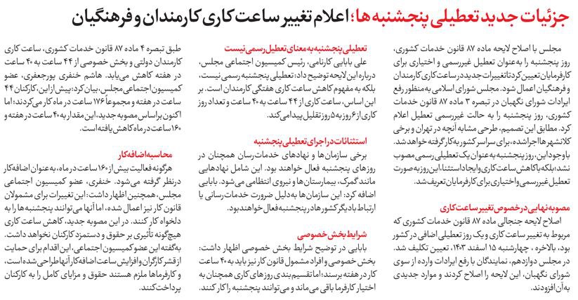 روزنامهٔ شهروند: جزئیات جدید تعطیلی پنجشنبهها، اعلام تغییر ساعت کاری کارمندان و فرهنگیان