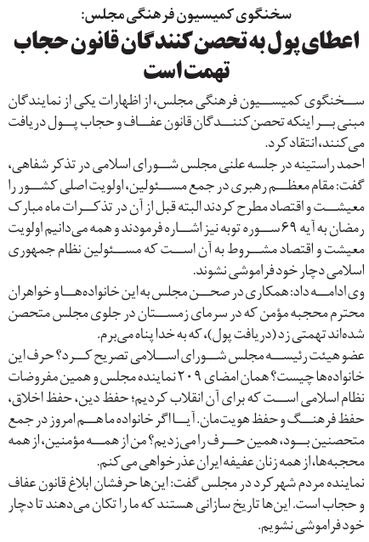 روزنامهٔ رویش ملت: اعطای پول به تحصنکنندگان قانون حجاب تهمت است
