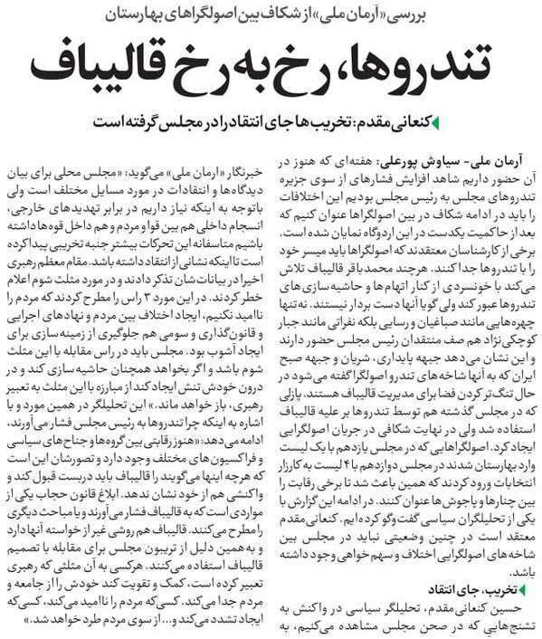 روزنامهٔ آرمان ملی: تندروها، رخ به رخ قالیباف