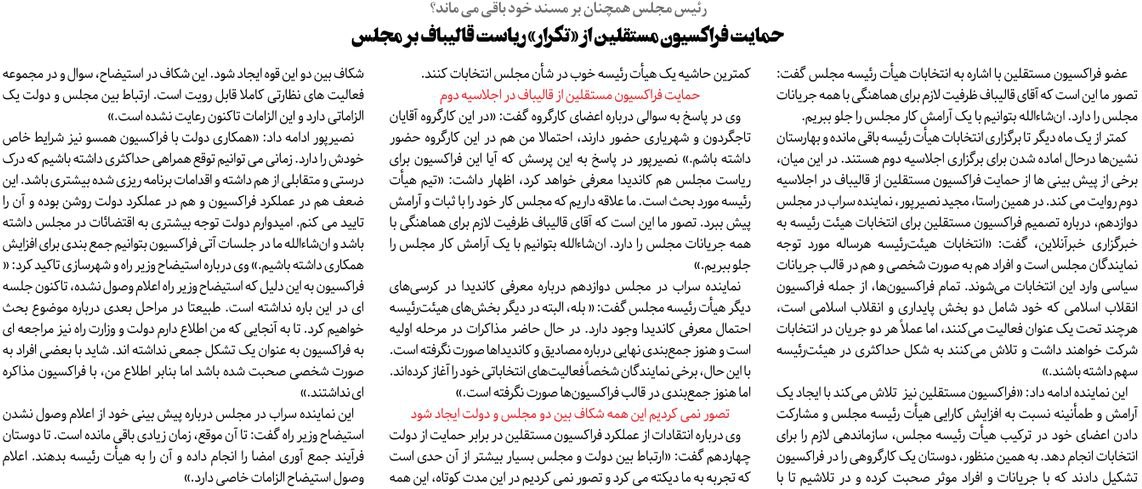 روزنامهٔ ابتکار: حمایت فراکسیون مستقلین از «تکرار» ریاست قالیباف بر مجلس