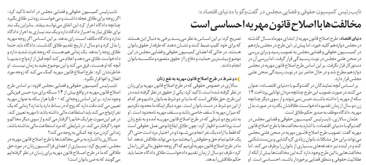 روزنامهٔ دنیای اقتصاد: مخالفتها با اصلاح قانون مهریه احساسی است
