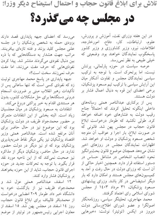 روزنامهٔ آرمان امروز: پیامدهای منفی استیضاح همتی