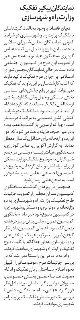 روزنامهٔ دنیای اقتصاد: نمایندگان پیگیر تفکیک وزارت راه و شهرسازی