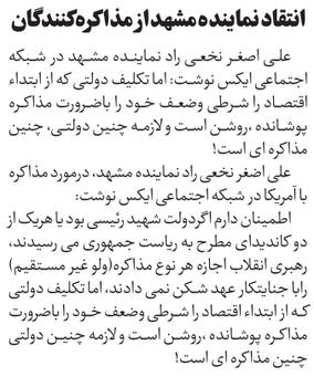 روزنامهٔ آرمان ملی: انتقاد نماینده مشهد از مذاکره کنندگان