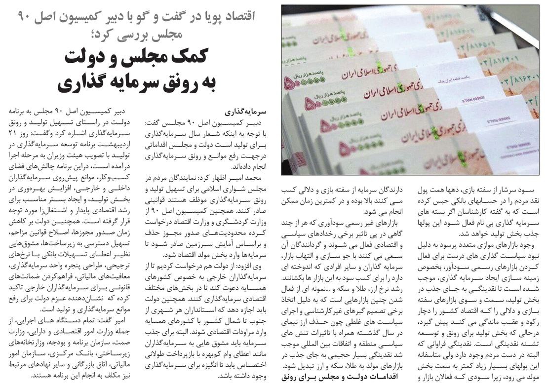 روزنامهٔ اقتصاد پویا: کمک مجلس و دولت به رونق سرمایهگذاری