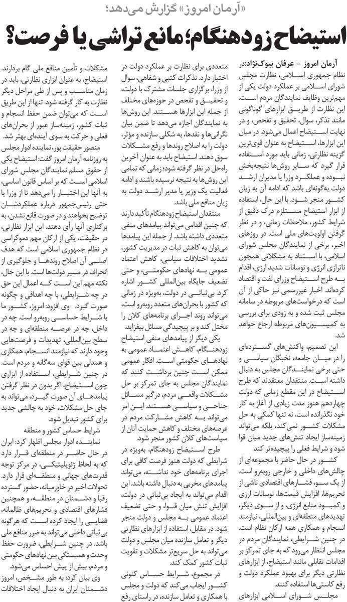 روزنامهٔ آرمان امروز: استیضاح زودهنگام، مانع تراشی یا فرصت؟