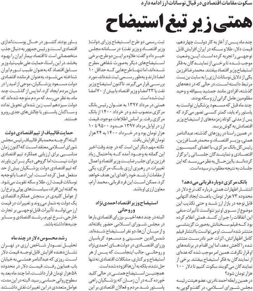 روزنامهٔ افکار: همتی زیر تیغ استیضاح