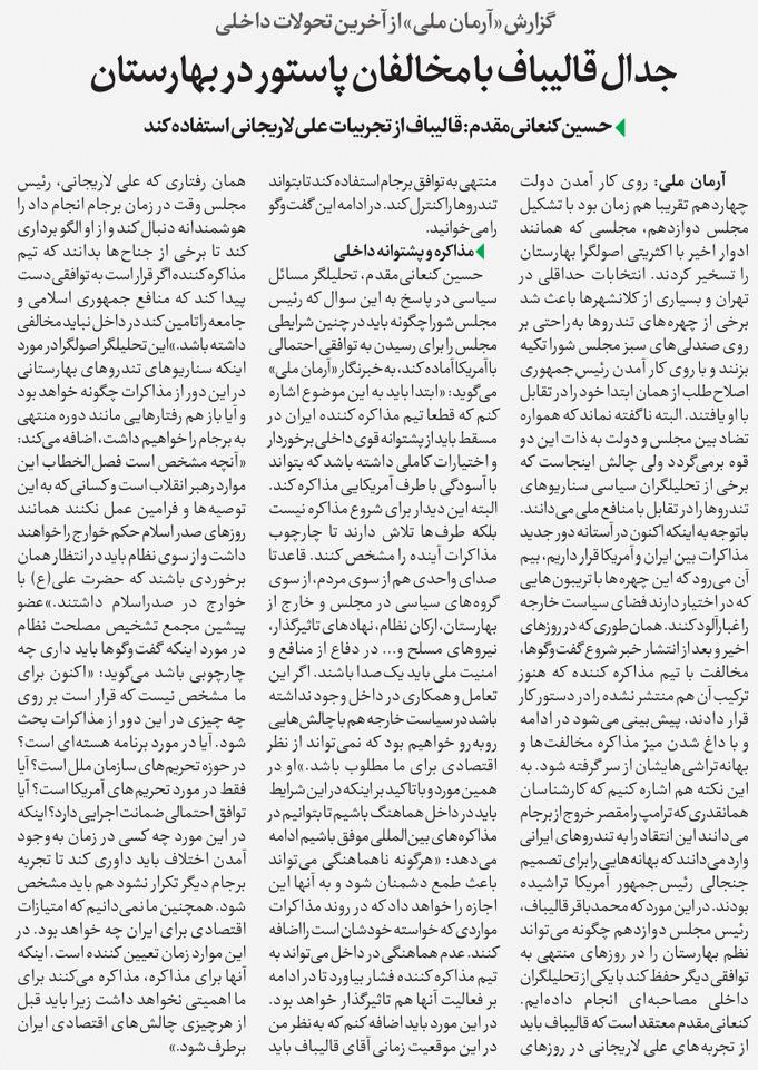 روزنامهٔ آرمان ملی: جدال قالیباف با مخالفان پاستور در بهارستان