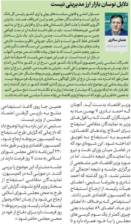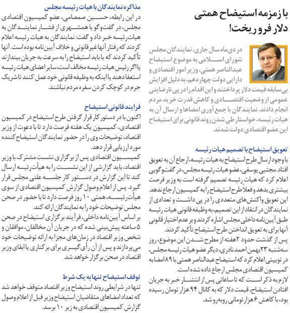 روزنامهٔ همشهری: با زمزمه استیضاح همتی دلار فرو ریخت!