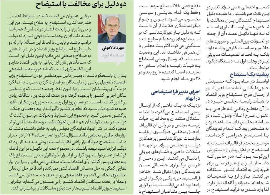روزنامهٔ ایران: دوگانه استیضاح و مصلحت