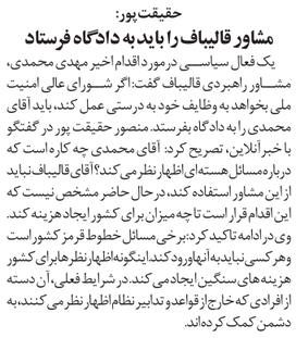 روزنامهٔ توسعه ایرانی: مشاور قالیباف را باید به دادگاه فرستاد