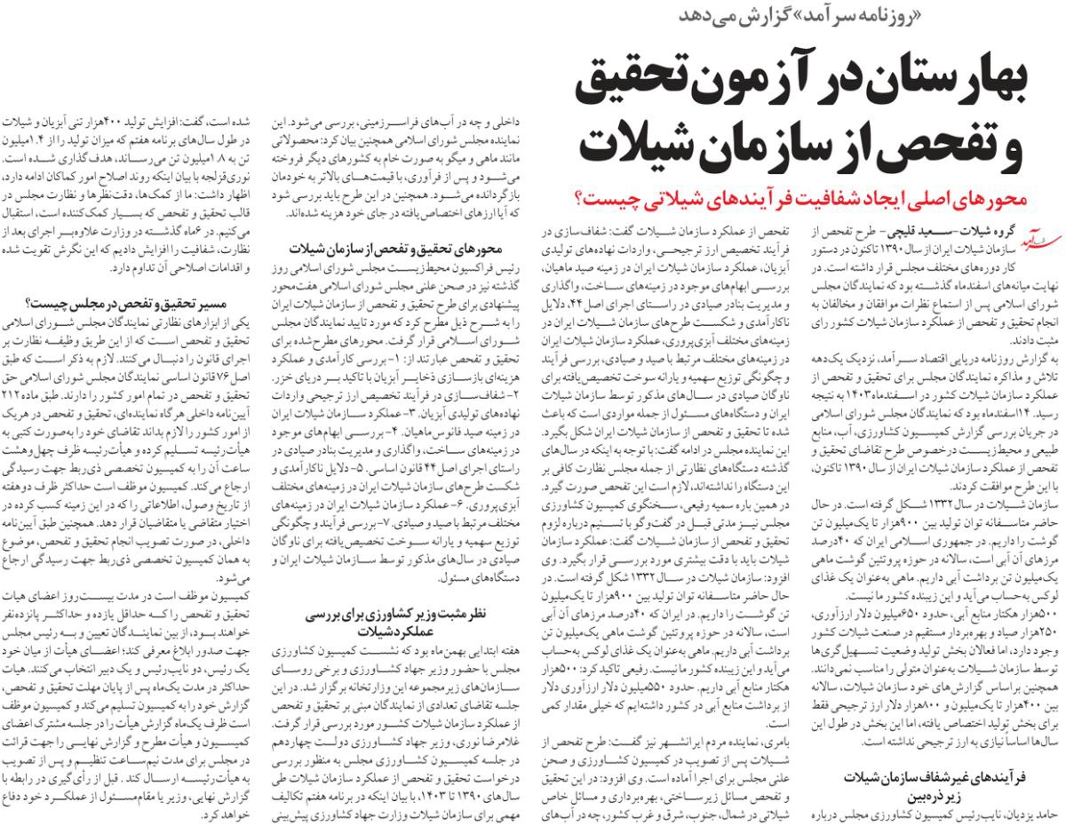 روزنامهد اقتصاد سرآمد: بهارستان در آزمون تحقیق و تفحص از سازمان شیلات