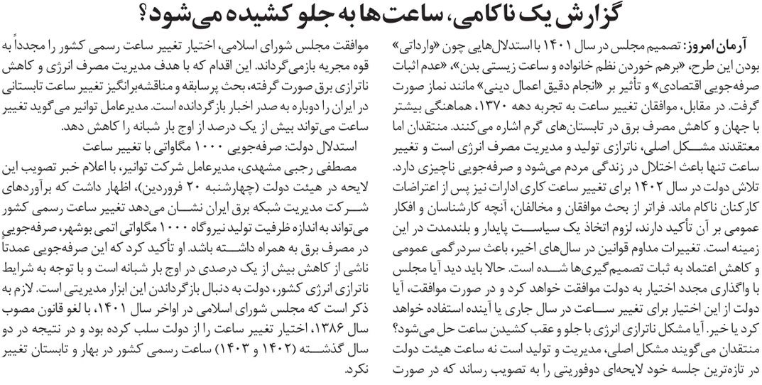 روزنامهٔ آرمان امروز: گزارش یک ناکامی، ساعت‌ها به جلو کشیده می‌شود؟