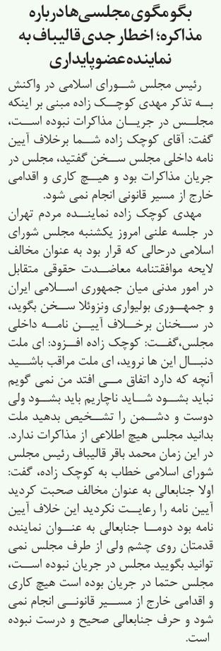 روزنامهٔ‌ آرمان امروز: اخطار جدی قالیباف به نماینده عضو پایداری