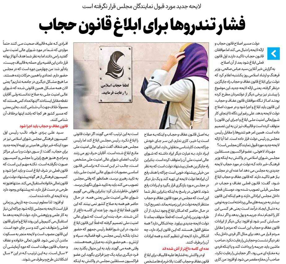 روزنامهٔ رویداد امروز: فشار تندروها برای ابلاغ قانون حجاب