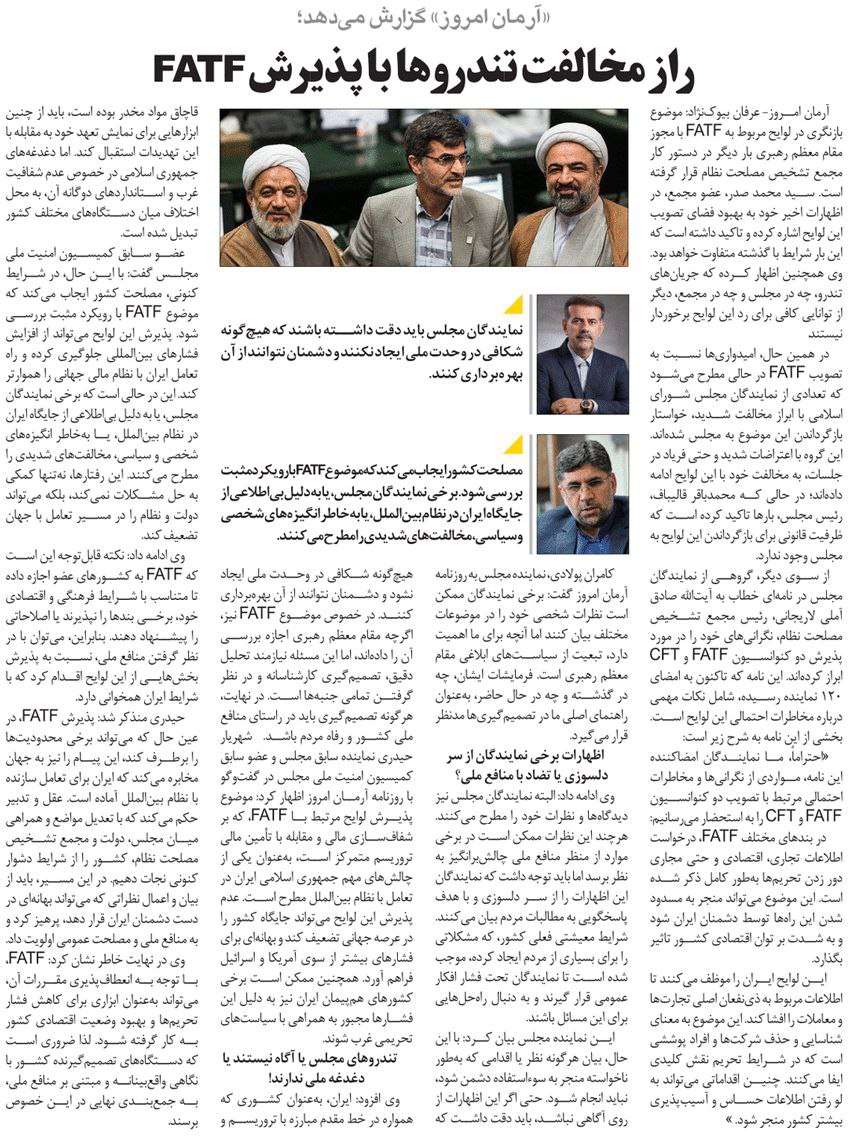 روزنامهٔ آرمان امروز: راز مخالفت تندروها با پذیرش FATF