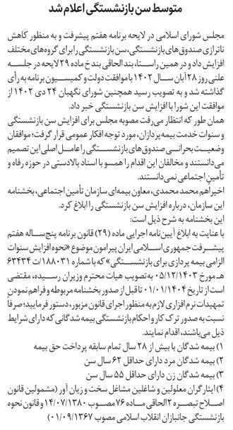 روزنامهٔ نقش اقتصاد: متوسط سن بازنشستگی اعلام شد