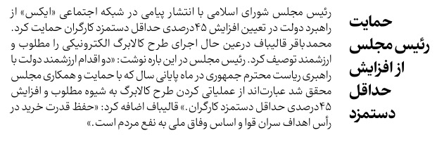 روزنامهٔ ایران: حمایت رئیس مجلس از افزایش حداقل دستمزد