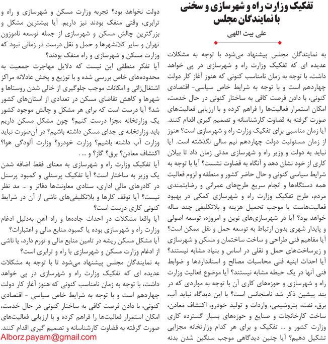 روزنامهٔ پیام زمان: تفکیک وزارت راه و شهرسازی و سخنی با نمایندگان مجلس