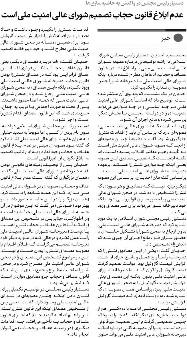 روزنامهٔ ایران: عدم ابلاغ قانون حجاب تصمیم شورای عالی امنیت ملی است