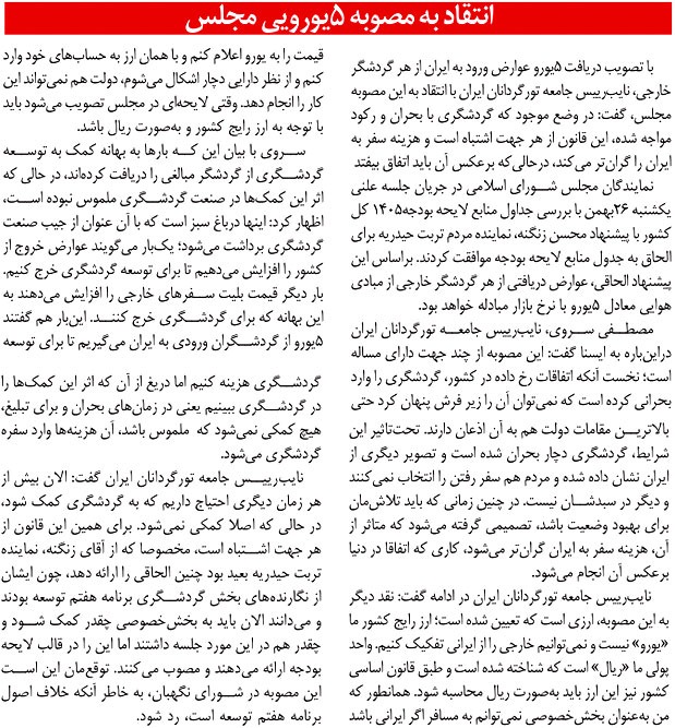 روزنامهٔ جهان صنعت: انتقاد به مصوبه ۵ یورویی مجلس