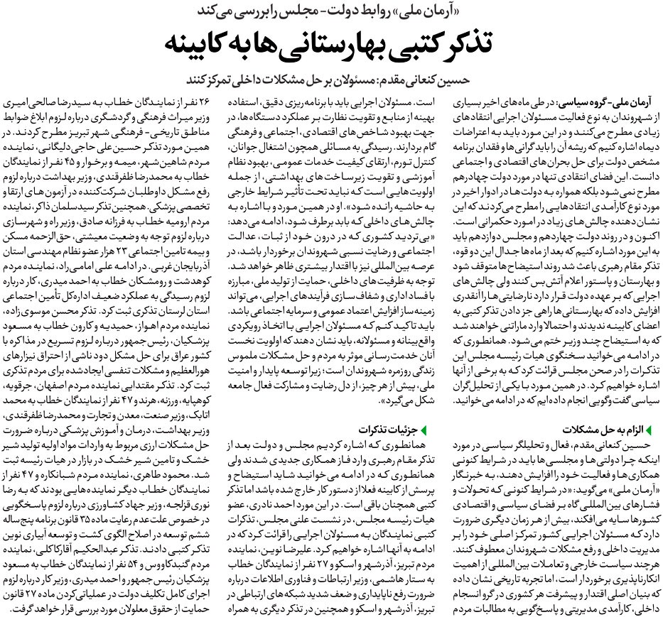 روزنامهٔ آرمان ملی: تذکر کتبی بهارستانیها به کابینه