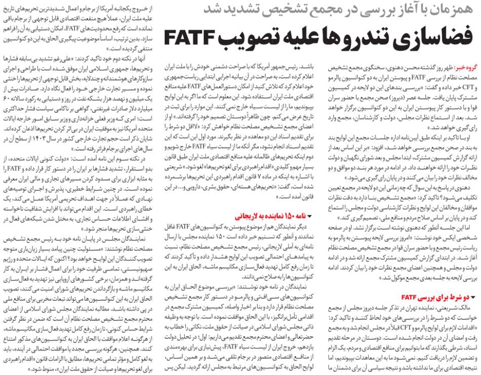 روزنامهٔ هم‌میهن: فضاسازی تندروها علیه تصویب FATF