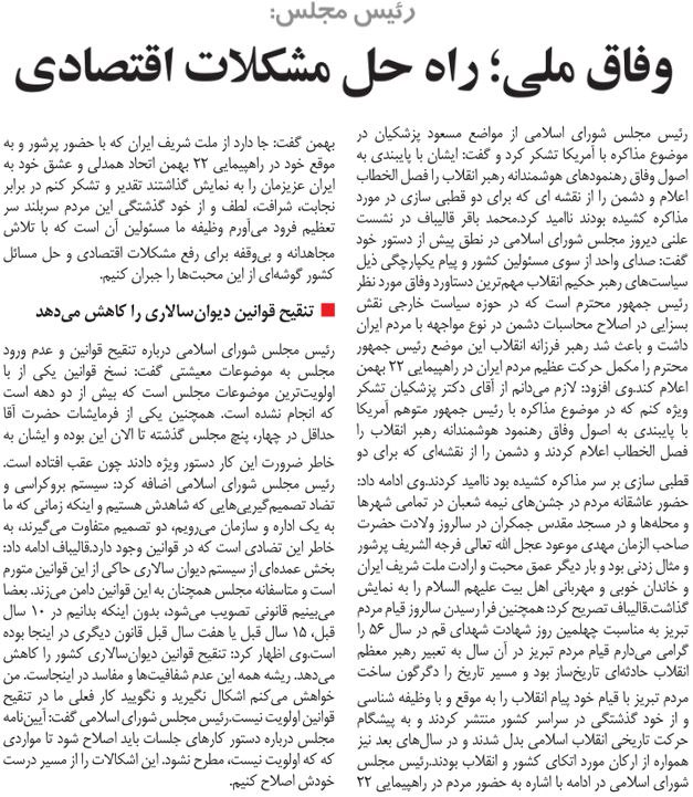 روزنامهٔ آفتاب اقتصادی: وفاق ملی، راه حل مشکلات اقتصادی