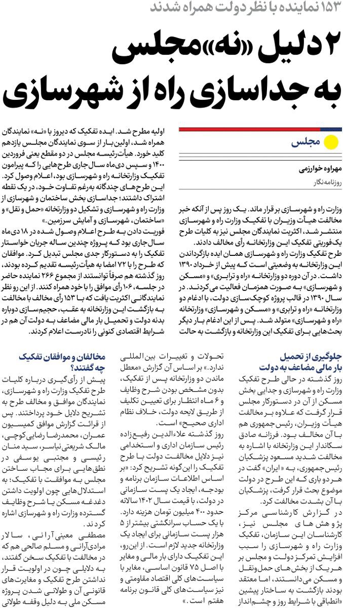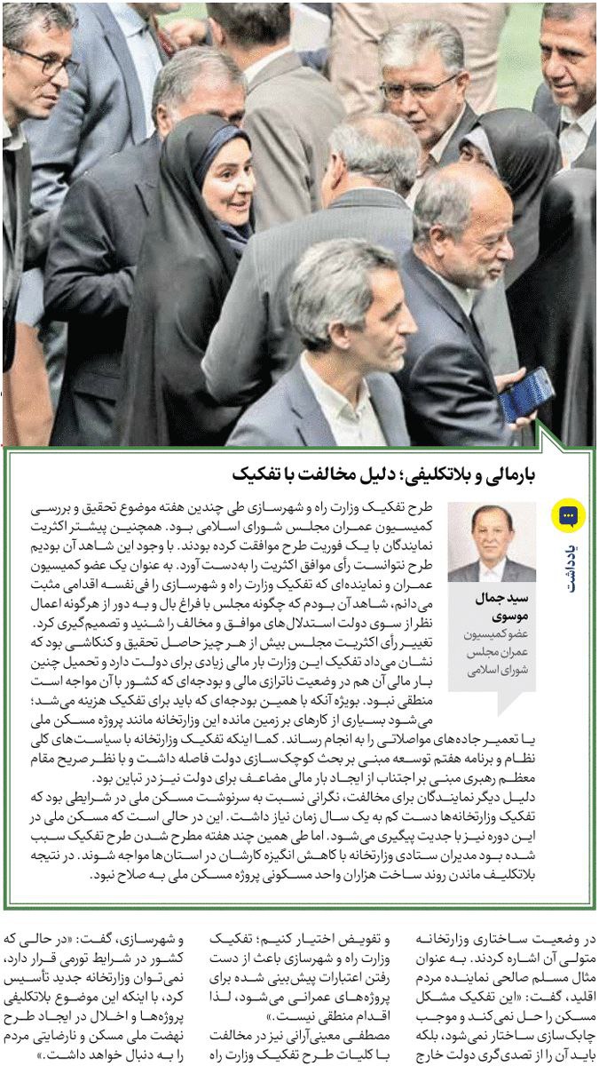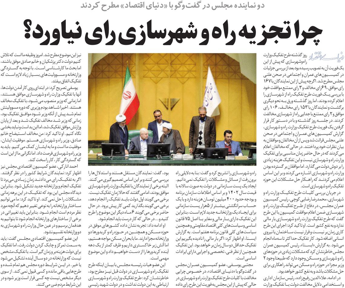 روزنامهٔ دنیای اقتصاد: چرا تجزیه راه و شهرسازی رای نیاورد؟