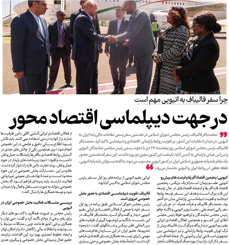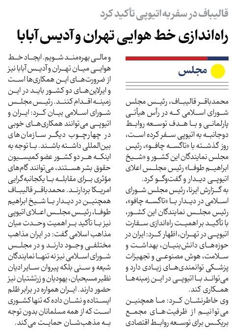 روزنامهٔ ایران: راه‌انداز خط هوایی تهران و آدیس آبابا