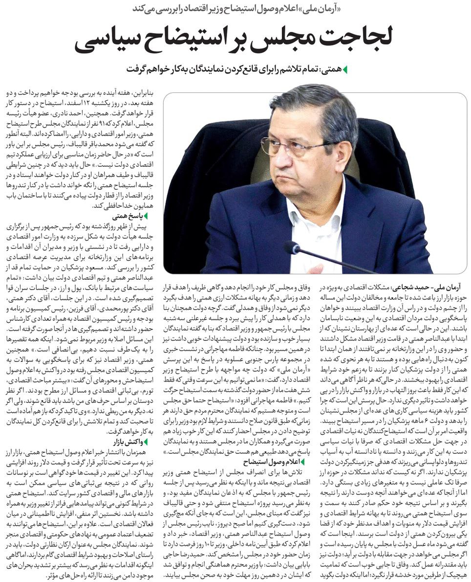 روزنامهٔ آرمان ملی: لجاجت مجلس بر استیضاح سیاسی