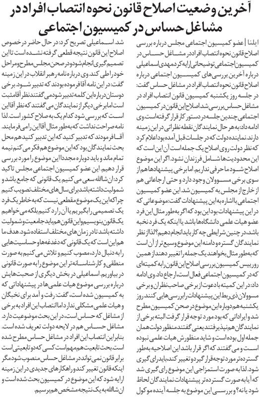 روزنامهٔ اعتماد: آخرین وضعیت اصلاح قانون نحوه انتصاب افراد در مشاغل حساس در کمیسیون اجتماعی