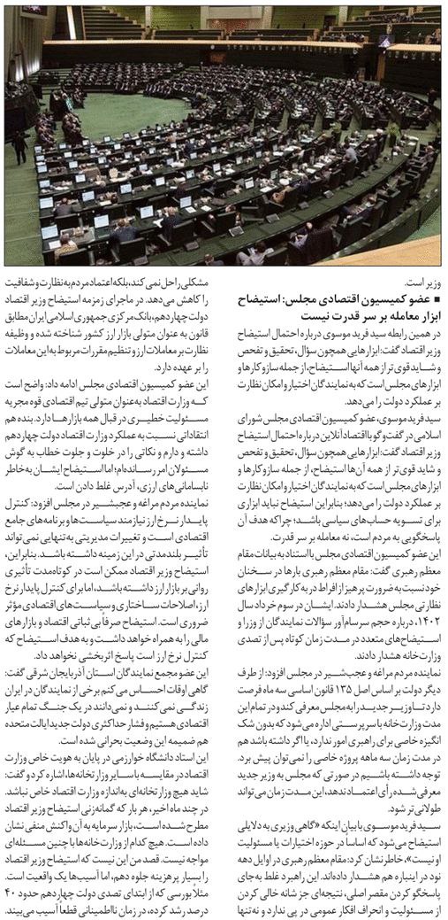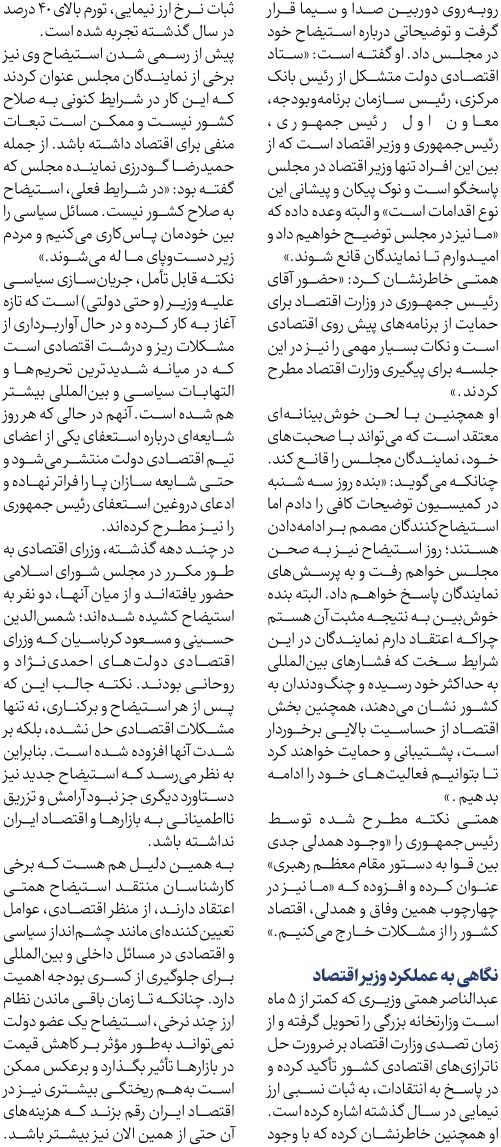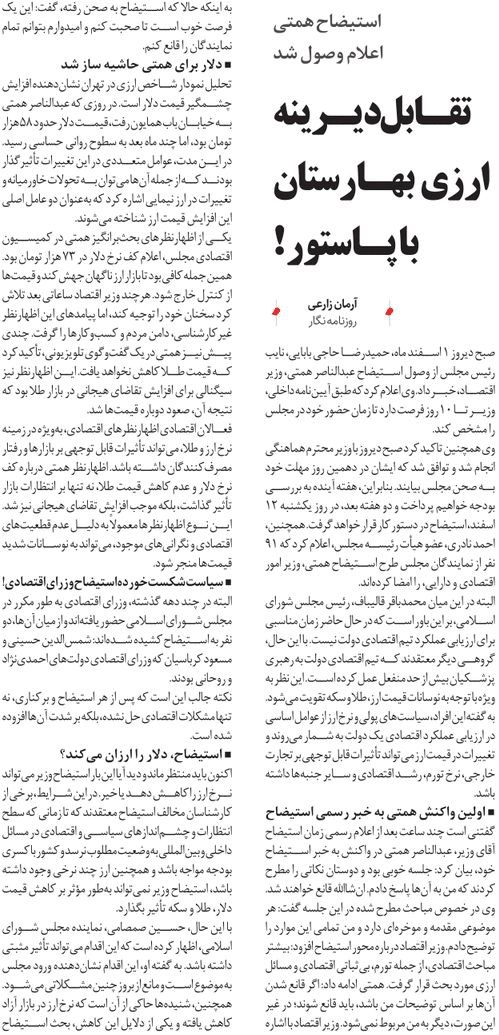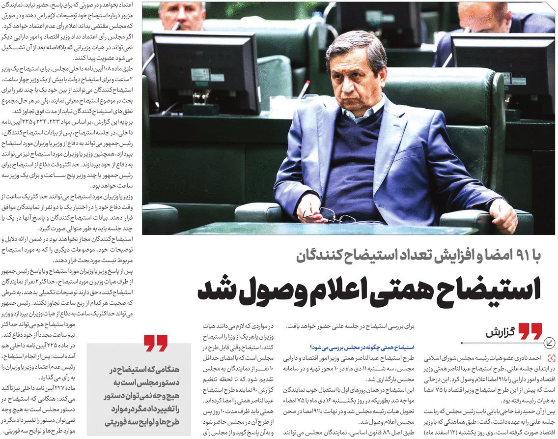روزنامهٔ چارسوق: استیضاح همتی اعلام وصول شد