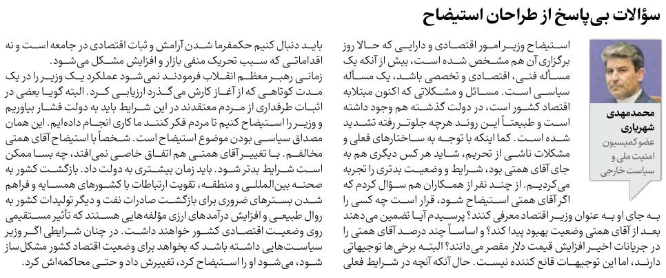 روزنامهٔ ایران: سوالات بی‌پاسخ از طراحان استیضاح
