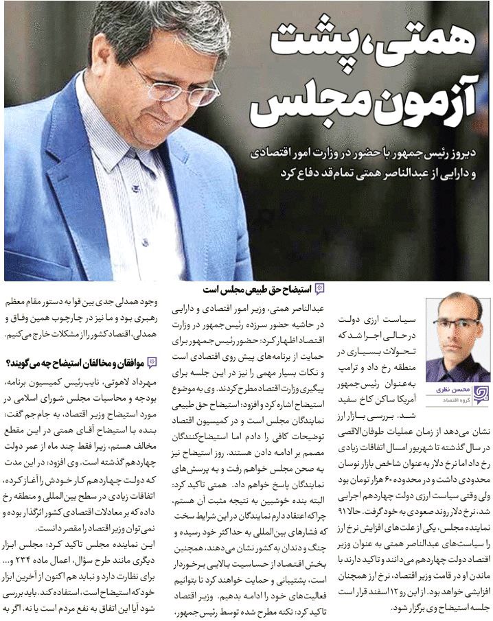روزنامهٔ چارسوق: استیضاح همتی اعلام وصول شد