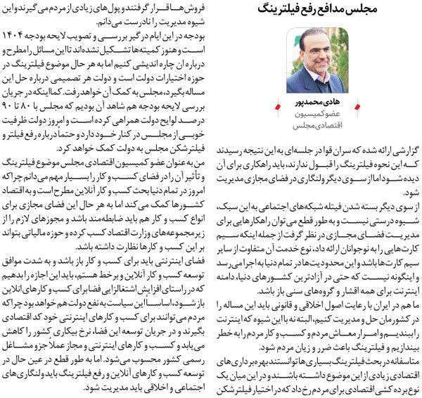 روزنامهٔ نقش اقتصاد: مجلس مدافع رفع فیلترینگ