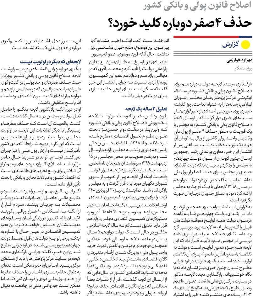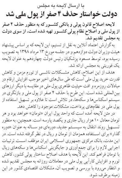 روزنامهٔ ایران: حذف ۴ صفر دوباره کلید خورد؟