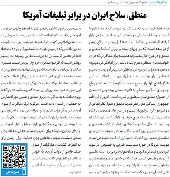روزنامهٔ جام جم: منطق، سلاح ایران در برابر تبلیغات آمریکا