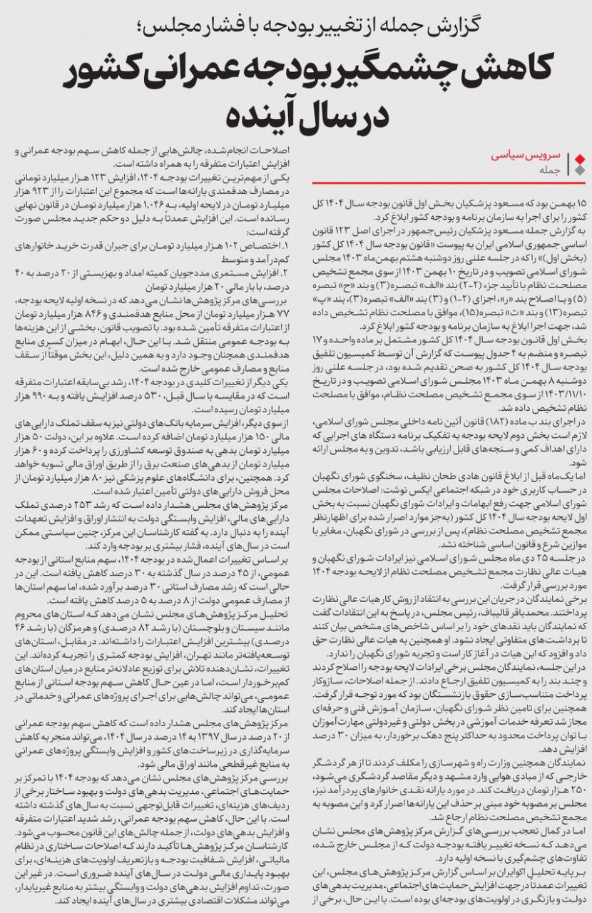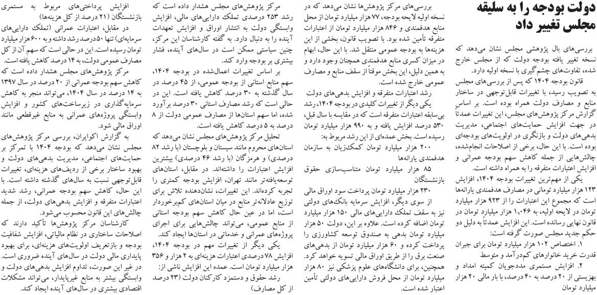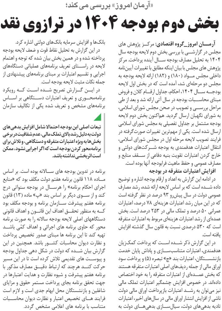 روزنامهٔ آرمان امروز: بخش دوم بودجه ۱۴۰۴ در ترازوی نقد