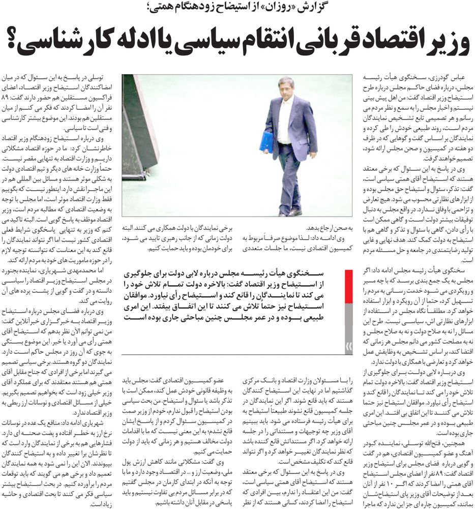 روزنامهٔ روزان: وزیر اقتصاد قربانی انتقام سیاسی یا ادله کارشناسی؟