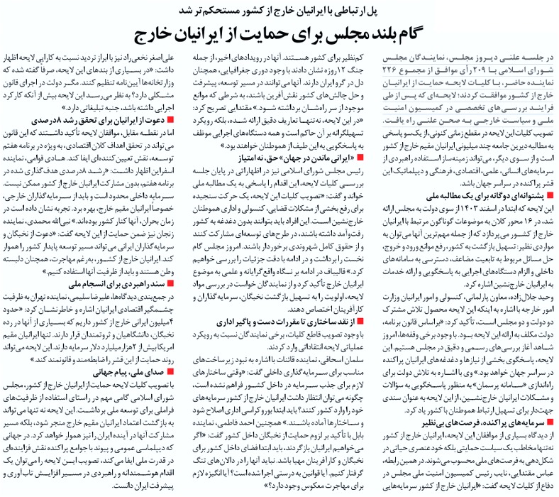 روزنامهٔ جوان: گام بلند مجلس برای حمایت از ایرانیان خارج