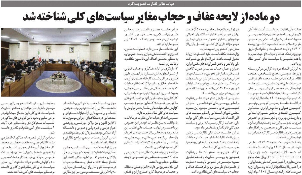 روزنامه اقتصاد مردم: دو ماده از لایحه عفاف و حجاب مغایر سیاست‌های کلی شناخته شد