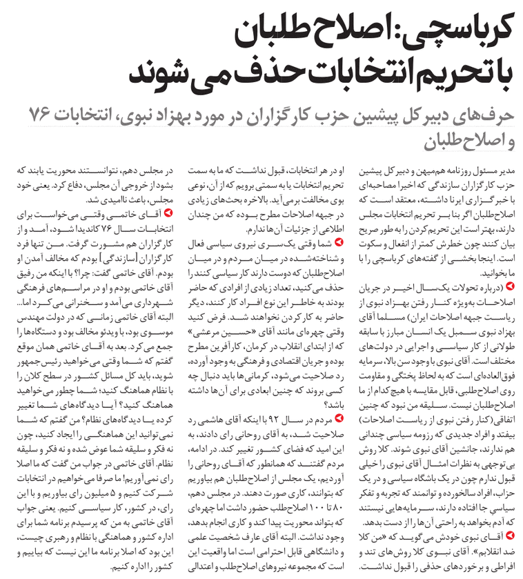 روزنامه هفت صبح: کرباسچی: اصلاح طلبان با تحریم انتخابات حذف می‌شوند