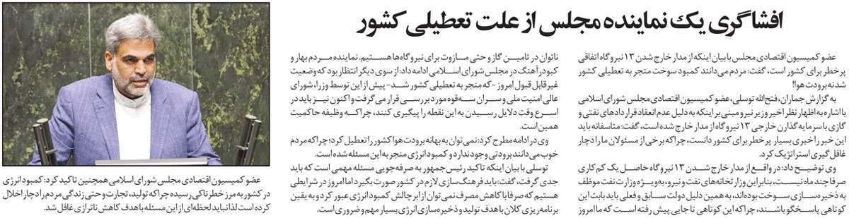 روزنامهٔ توسعهٔ ایرانی: افشاگری یک نماینده مجلس از علت تعطیلی کشور