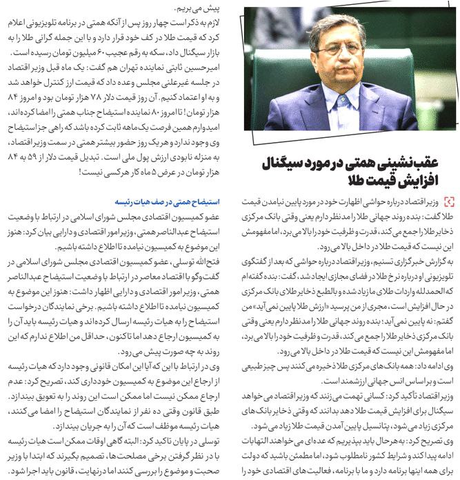 روزنامهٔ چارسوق: عقب‌نشینی همتی در مورد سیگنال افزایش قیمت طلا