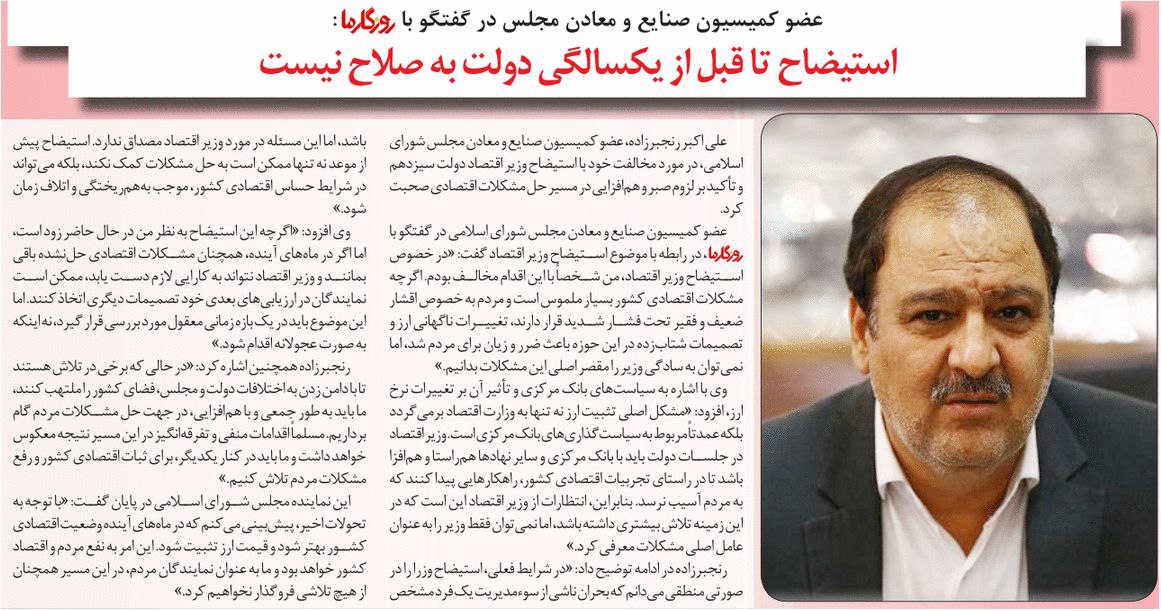 روزنامهٔروزگار ما: استیضاح تا قبل از یکسالگی دولت به صلاح نیست