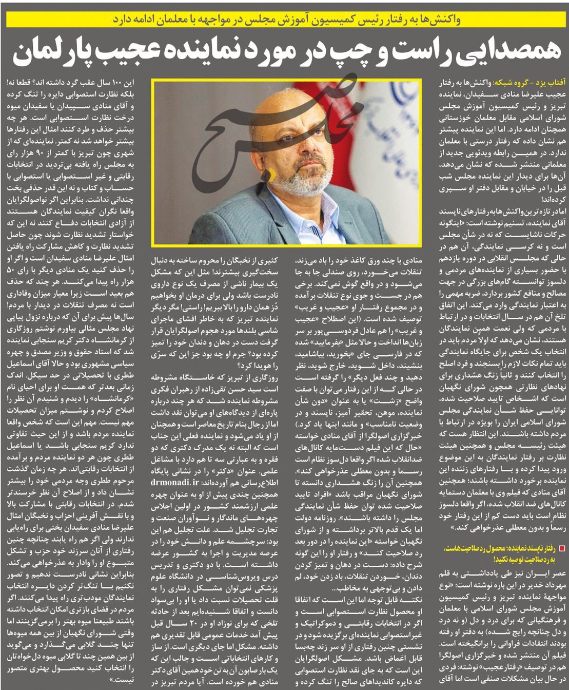 روزنامهٔ آفتاب یزد: همصدایی راست و چپ در مورد نماینده عجیب پارلمان